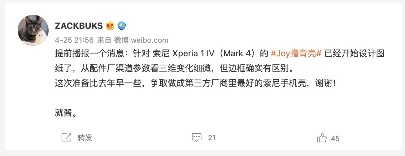 中国版ツイッターweiboに投稿されている内容となりますが、Xperia 1 IVのケースは「Joy撸背壳」という会社がすでに設計を開始しているようですね。