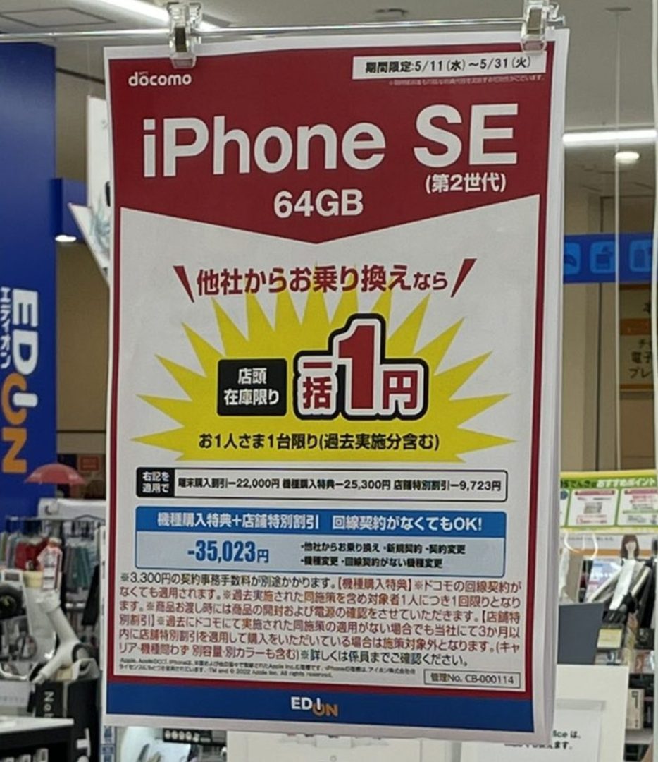 iPhoneSE2 iPhone12mini MNP 一括 1円で販売中 エディオンが安い 5月末まで対応?