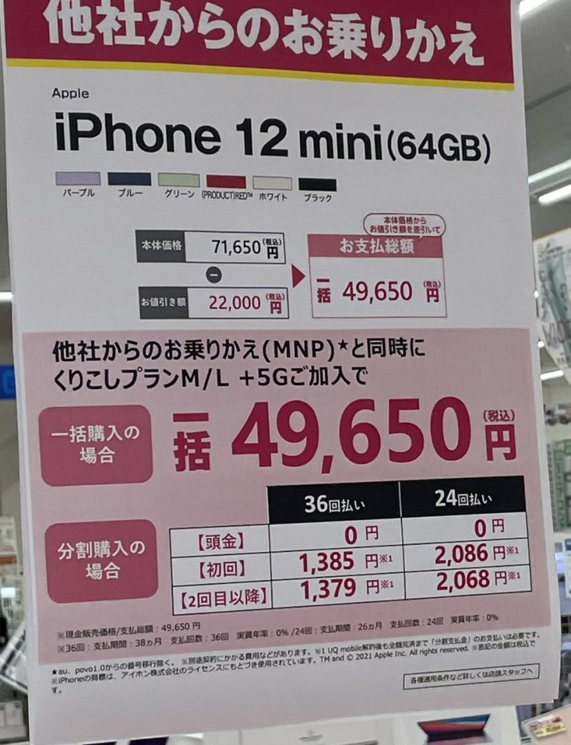 こちらはUQモバイルのiPhone12miniが一括価格で販売されております。