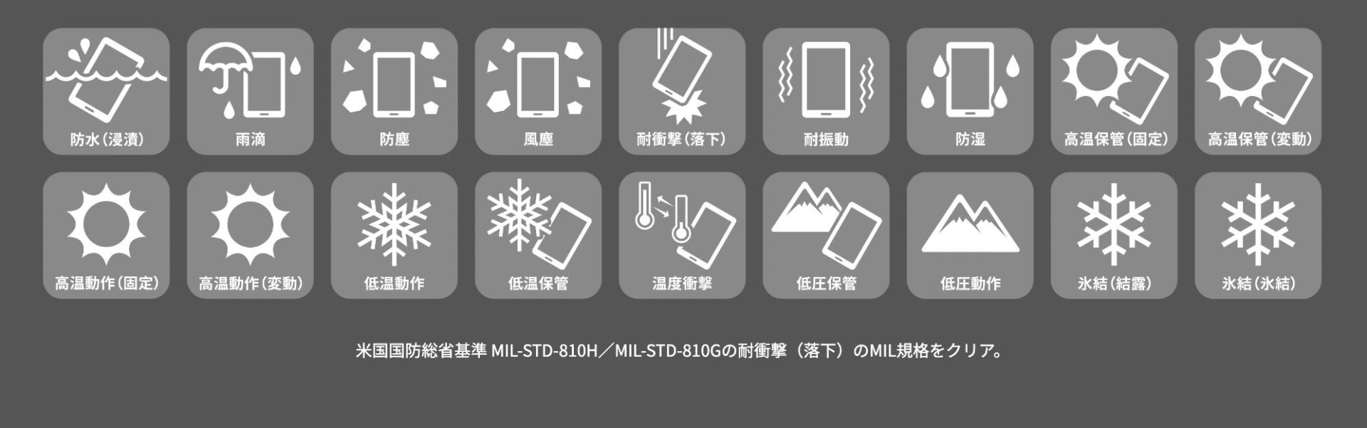 MIL規格に対応していると単純に、落としても壊れにくいということや、防水や防塵性能、防滴や低温高温で利用する比較的過酷な環境であったとしても、利用することが可能ということになります。
