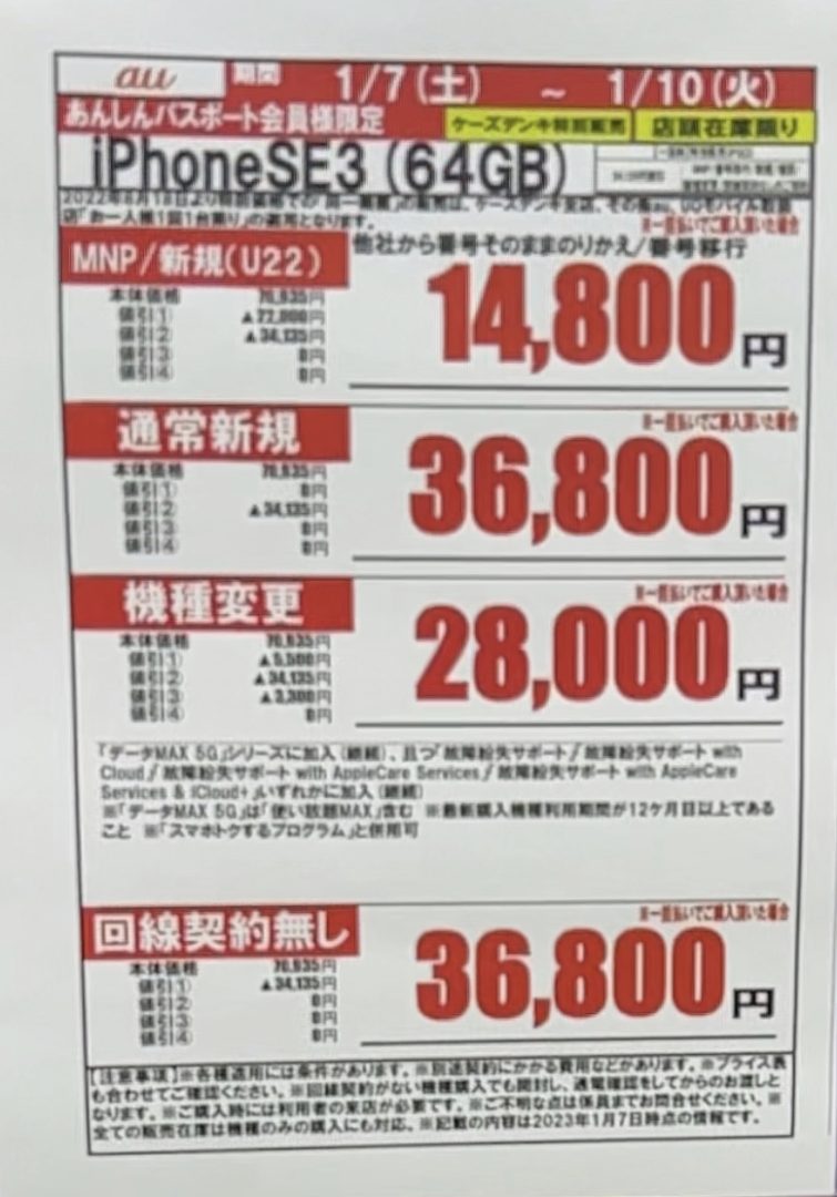 iPhoneSE3の64GBは14800円となっており、もうiPhoneSE3の在庫もどこのキャリアも品薄ではないかと思います。