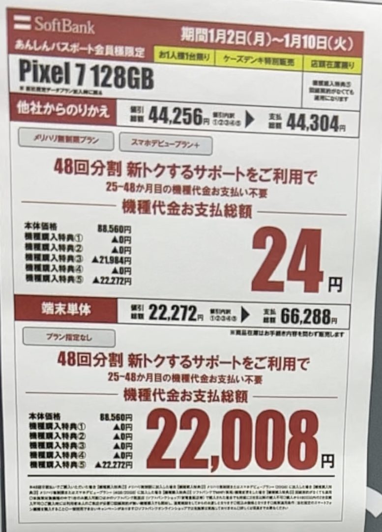 Pixel7が24円となっていますので、実質価格としては結構安価なのかなぁ〜という印象です。