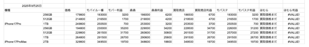 9月25日時点でのiPhone17Proシリーズの買取価格 アップルマラソンやる人は価格推移も気になるところ・・・ 過去分も出しているので、現在買取価格上昇中なので、まだホールドするか売るのか非常に悩ましいところです。 Proシリーズであればもう手放してもいいんじゃないですか?